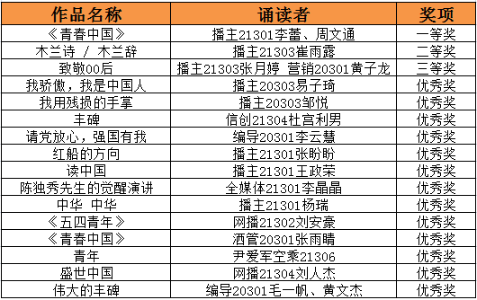 根据校内初赛评选结果,推荐获得校内一、二、三等奖的三个作品参加第五届湖北省高校“寻找最美之声”诵读大赛省级复赛。