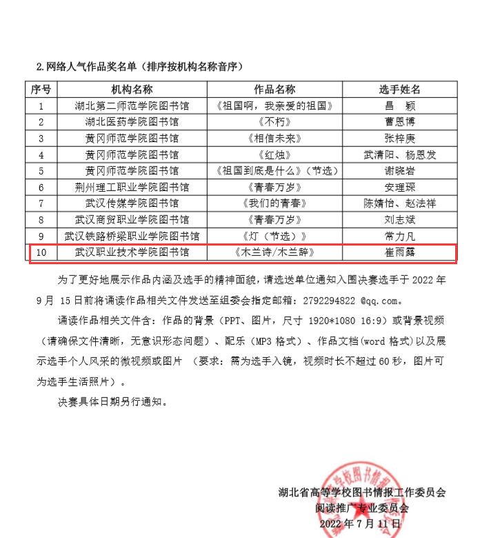 (通讯员 吴振寰)近日,“青春之声越百年”暨第五届湖北省高校 “寻找最美之声”诵读大赛复赛结果揭晓。武汉职业技术学院文化与传媒学院学生李蕾、周文通的作品《青春中国》入围决赛,崔雨露的作品《木兰诗/木兰辞》获网络人气作品奖。
